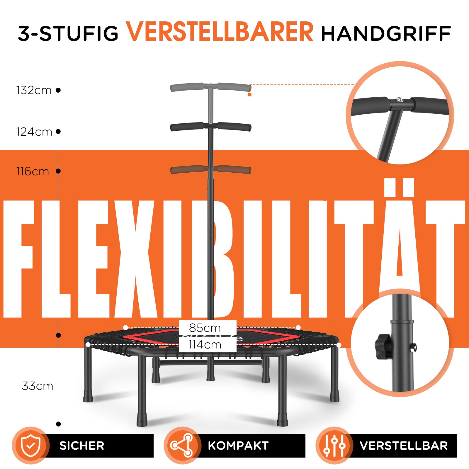 MAXIMALE SICHERHEIT & ANPASSUNGSFÄHIGKEIT: Der höhenverstellbare Handgriff (116–132 cm) passt sich deiner Körpergröße und Trainingsintensität an. Rutschfeste Füße, sichere Verriegelungen sowie ein robuster Stahlrahmen sorgen für Stabilität bei jedem Workout. Belastbar bis zu 150 kg – ideal für anspruchsvolle Fitnessziele.