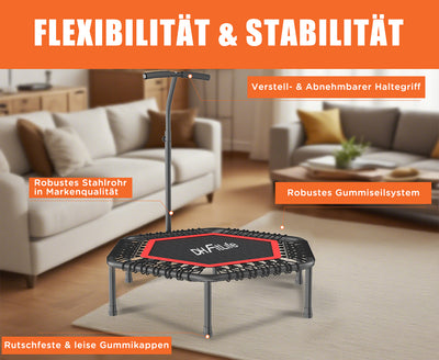 SANFTES & ERGONOMISCHES SPRUNGERLEBNIS: 36 hochelastische Gummiseile sorgen für ein gleichmäßiges, harmonisches Springen. So fühlt sich jeder Sprung angenehm natürlich an – ideal für gelenkschonende Workouts mit maximalem Komfort, ganz gleich ob Einsteiger oder Fortgeschrittener.